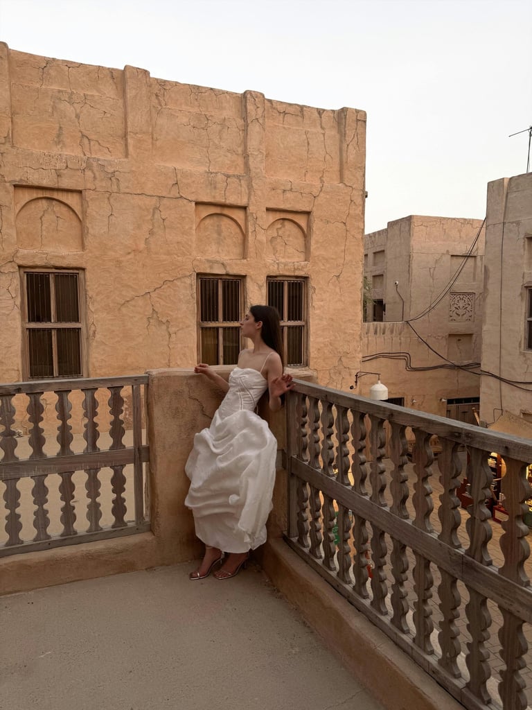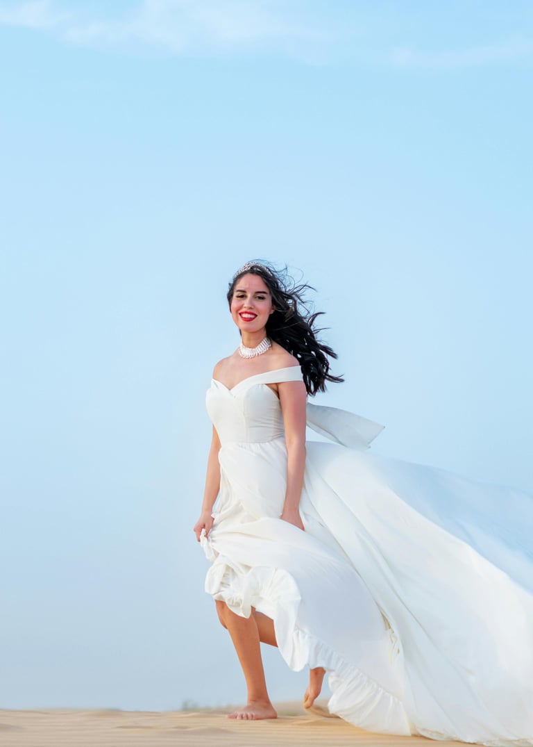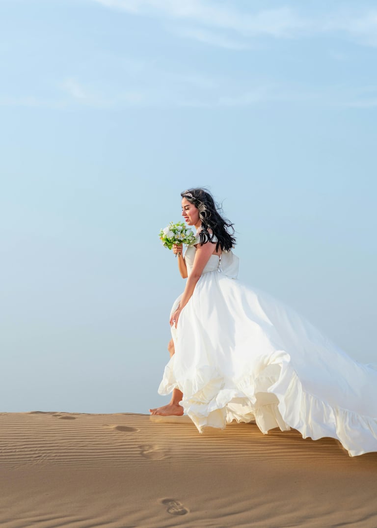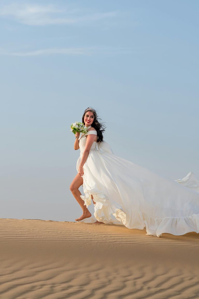 A luxury shoot with a flowing gown in a dramatic location β a Dubai must-do for tourists & influencers.